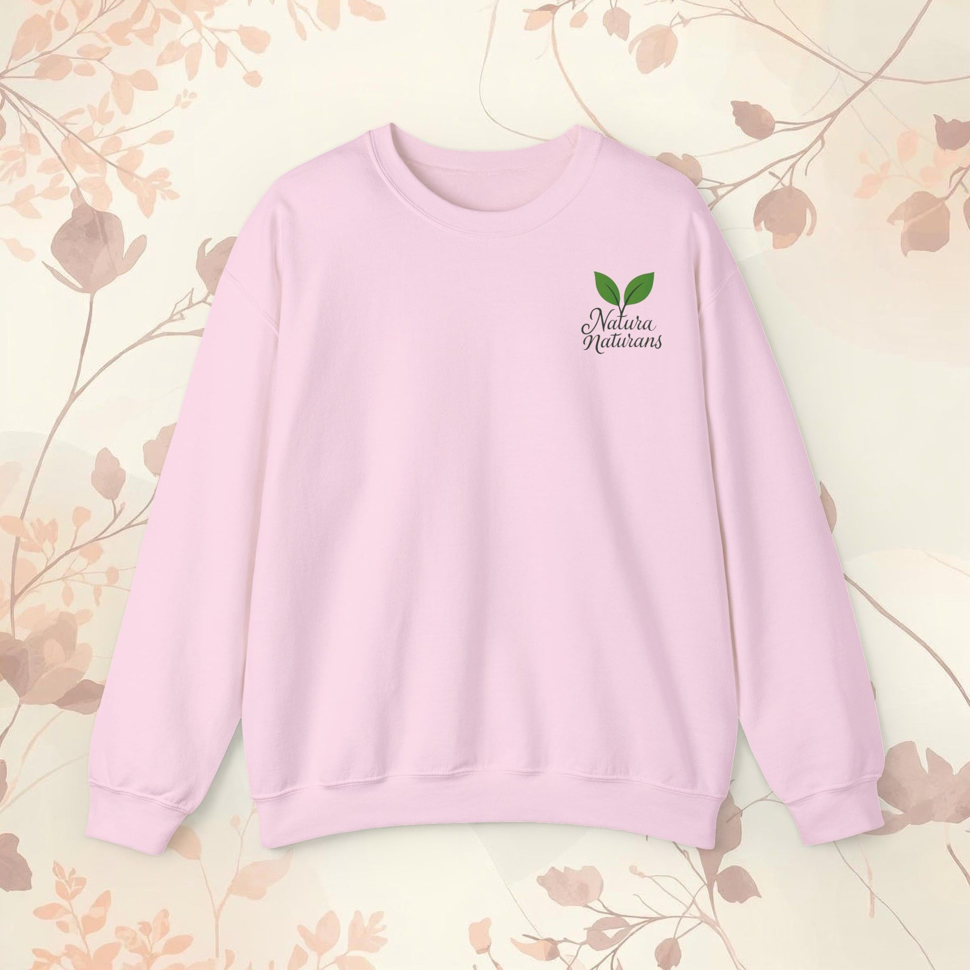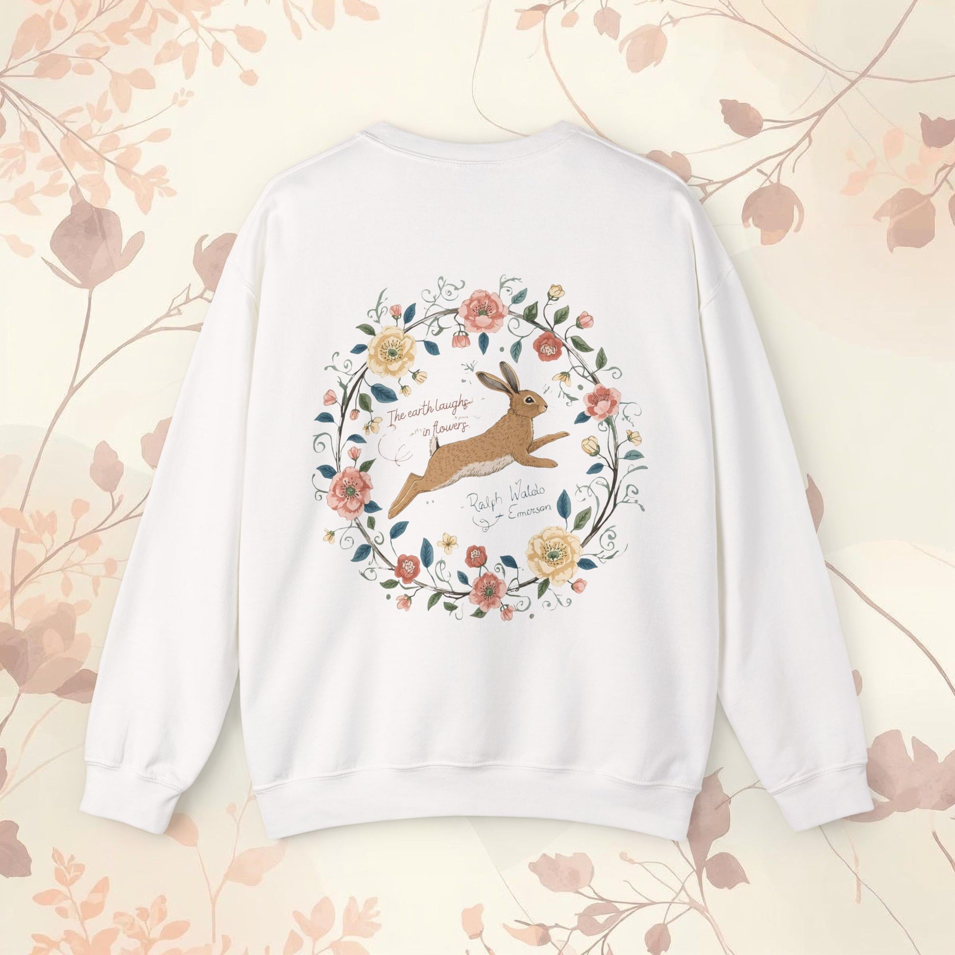 A cozy unisex crewneck sweatshirt featuring a printed floral wreath and leaping hare design. This sweatshirt exudes a charming and whimsical vibe, perfect for adding a touch of nature-inspired style to your wardrobe. Ideal for adults looking for a unique and artistic piece to wear during springtime, Easter, or any casual occasion.