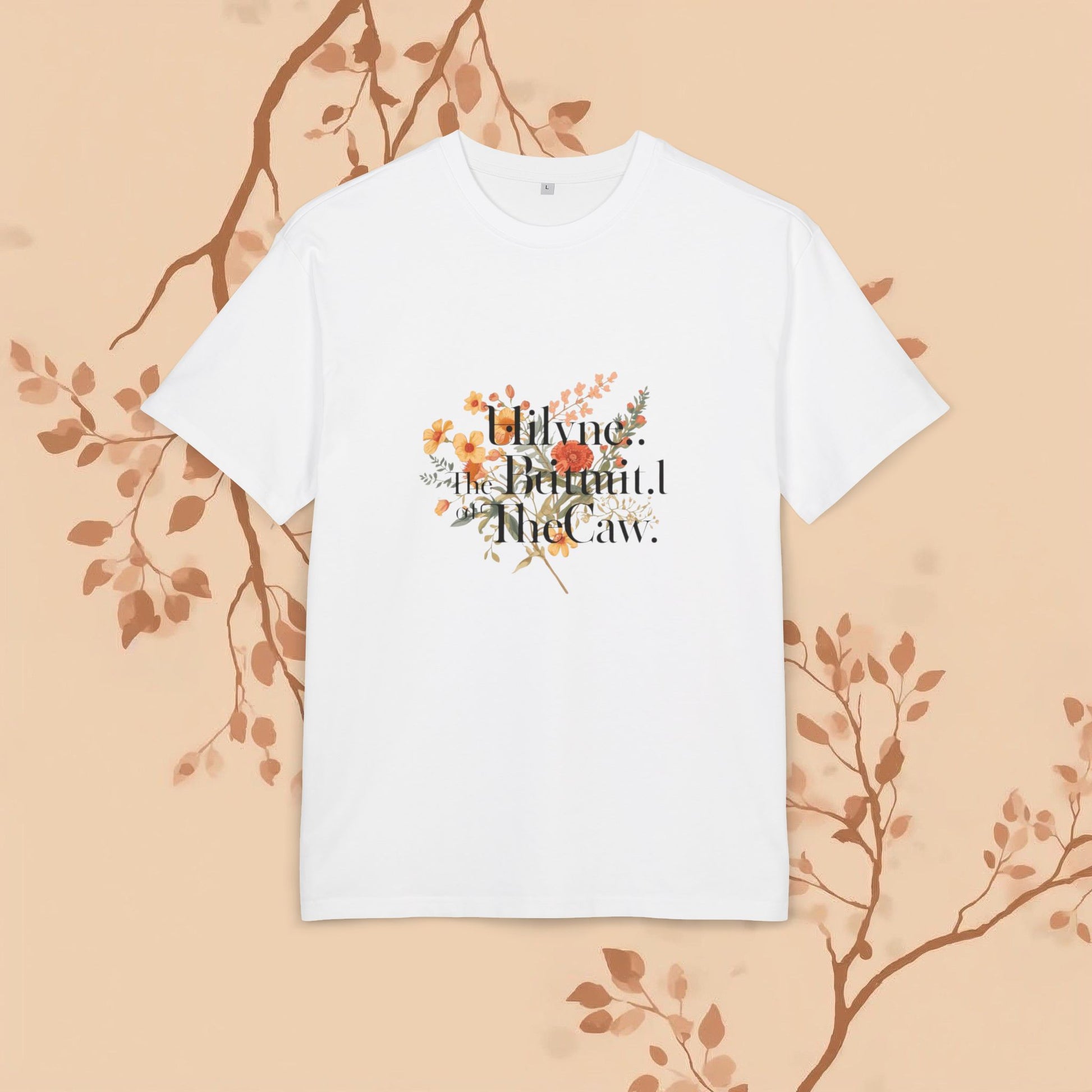 A comfortable and relaxed tee featuring a unique design of flowers with nonsensical words. This tee is perfect for those looking for a laidback style with a touch of whimsy. Suitable for adults, this tee is ideal for casual wear or as a statement piece for a quirky ensemble. Great for adding a fun element to everyday outfits or for a casual day out.